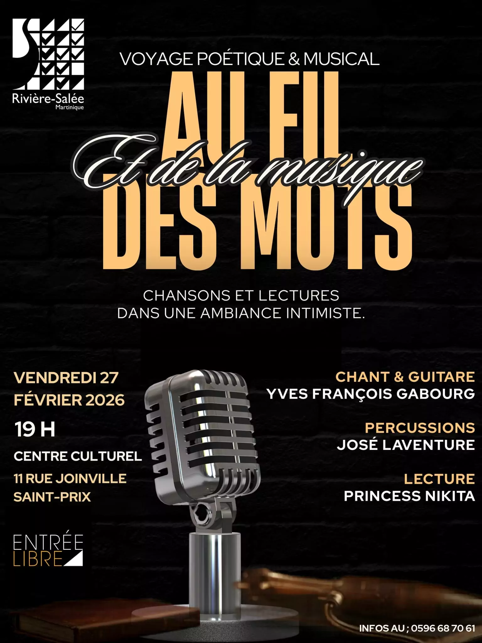 La Ville de Rivière-Salée vous invite à une soirée poétique et musicale où la voix, la guitare et les mots s’entrelacent pour créer une atmosphère intime et inspirante.