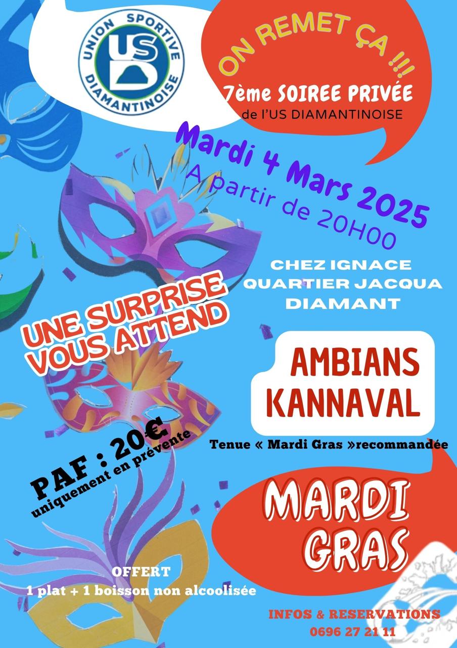 L’US DIAMANTINOISE « remet ca! » et t’invite à sa soirée carnaval qu’elle organise 𝗹𝗲 𝗺𝗮𝗿𝗱𝗶 𝟬𝟰 𝗺𝗮𝗿𝘀 𝟮𝟬𝟮𝟱, 𝗮̀ 𝗽𝗮𝗿𝘁𝗶𝗿 𝗱𝗲 𝟮𝟬 𝗵𝗲𝘂𝗿𝗲𝘀 𝗰𝗵𝗲𝘇 𝗜𝗚𝗡𝗔𝗖𝗘 𝗮𝘂 𝗤𝘂𝗮𝗿𝘁𝗶𝗲𝗿 𝗝𝗮𝗰𝗾𝘂𝗮 𝗮𝘂 𝗗𝗜𝗔𝗠𝗔𝗡𝗧.