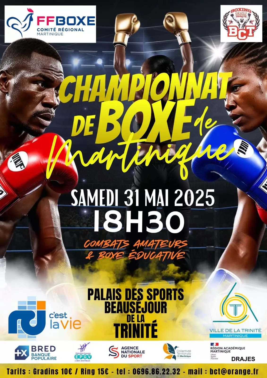 Le Boxing Club de Trinité en partenariat avec le Comité Boxe de Martinique vous invite au championnat de boxe de Martinique le 31 Mai 2025 au Palais des Sports de Trinité à 18h30.