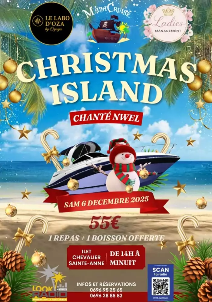 Laisse-toi aller, c’est la vibe de Noël qui prend le contrôle sur l’ilet Chevalier ! Avec MADACRUISE et LOOK RADIO ANTILLES, c’est la fête, c’est la joie !