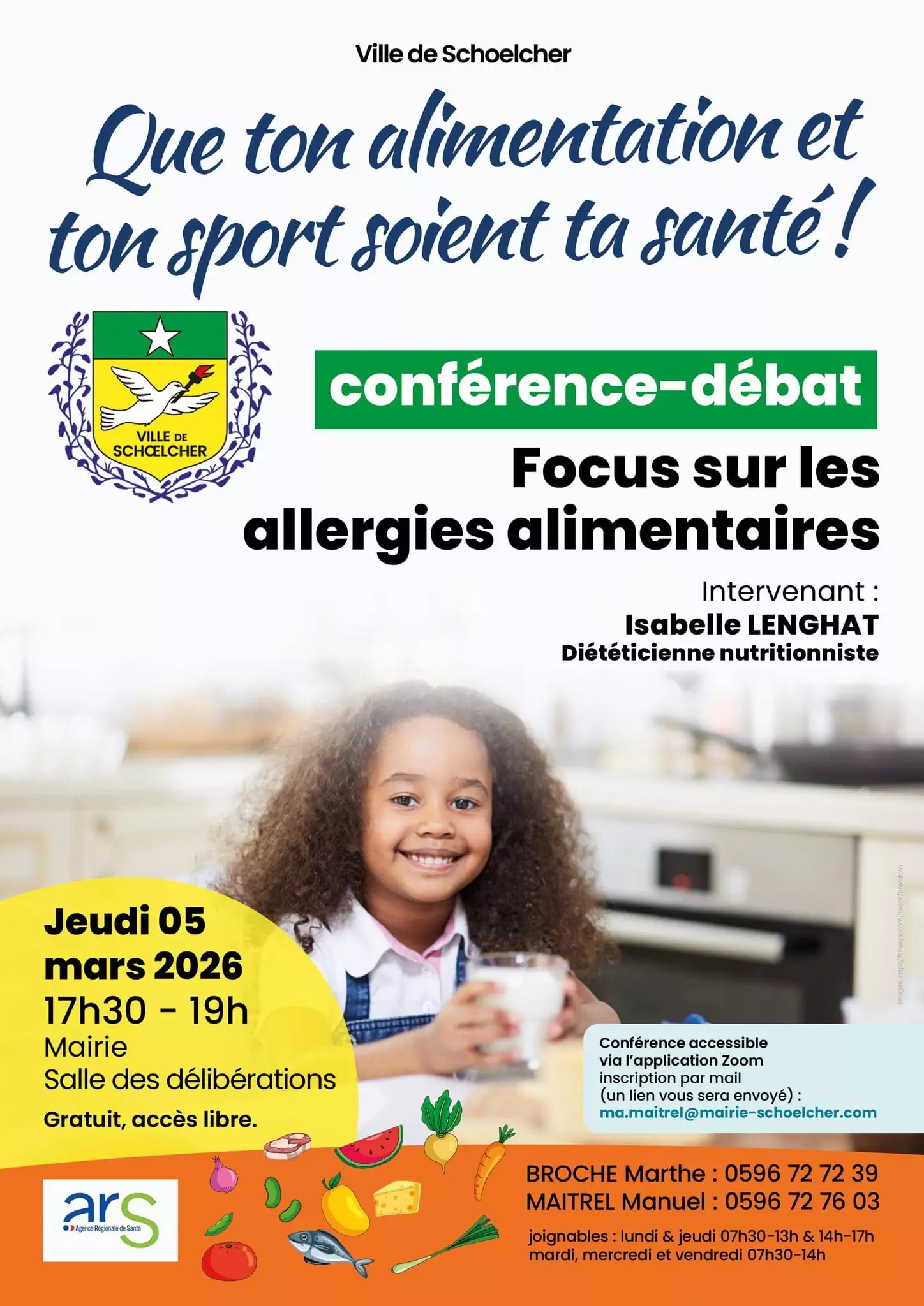 Dans le cadre du programme « Que ton alimentation et ton sport soient ta santé ! », la Ville de Schoelcher vous invite à une conférence-débat dédiée aux allergies alimentaires.