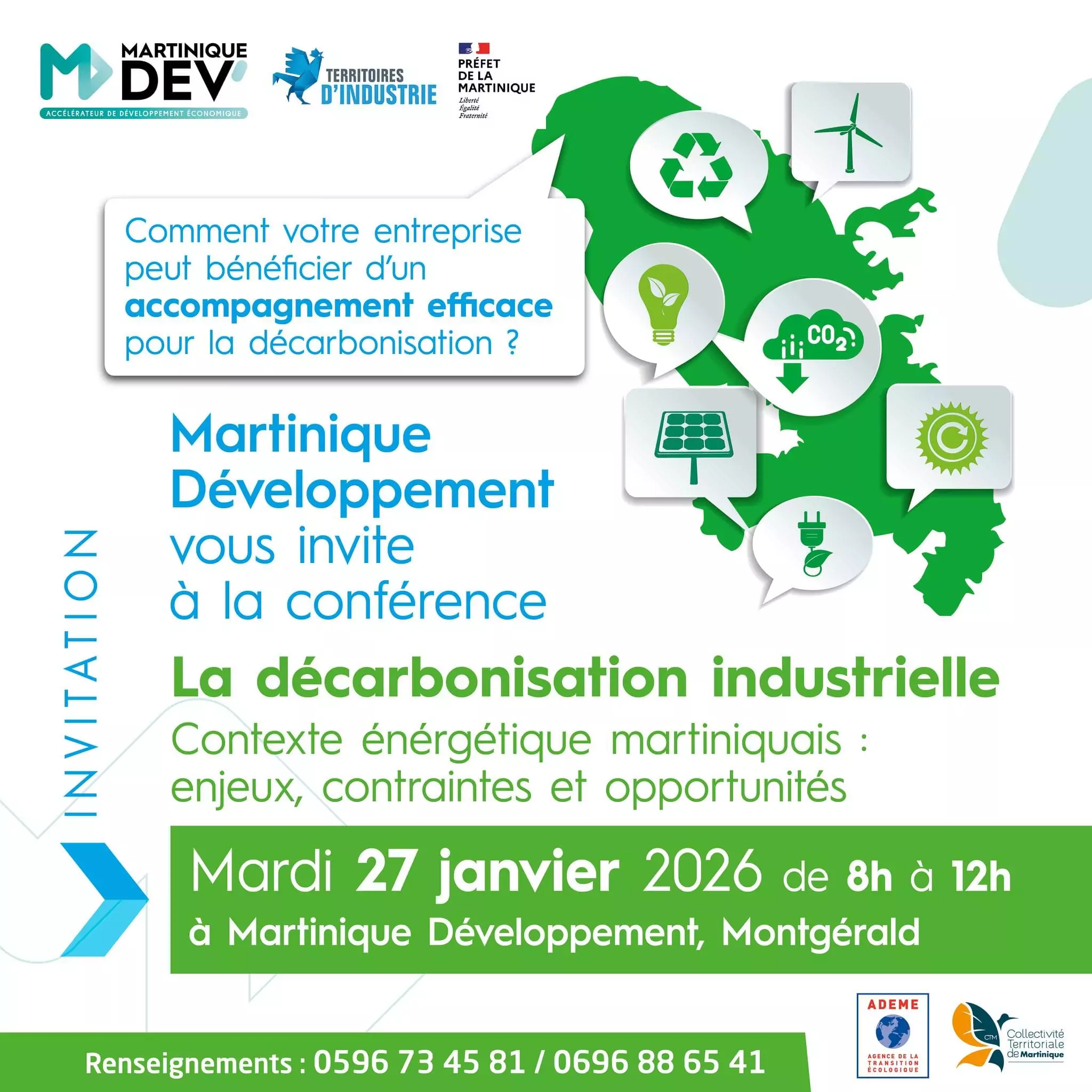 Dans un contexte de transition énergétique accélérée, Martinique Développement, vous invite à une conférence dédiée à la décarbonation industrielle, pour découvrir des solutions concrètes et finançables au service des entreprises martiniquaises, ce mardi 27 janvier 2026, de 8h à 12h à Montgérald.