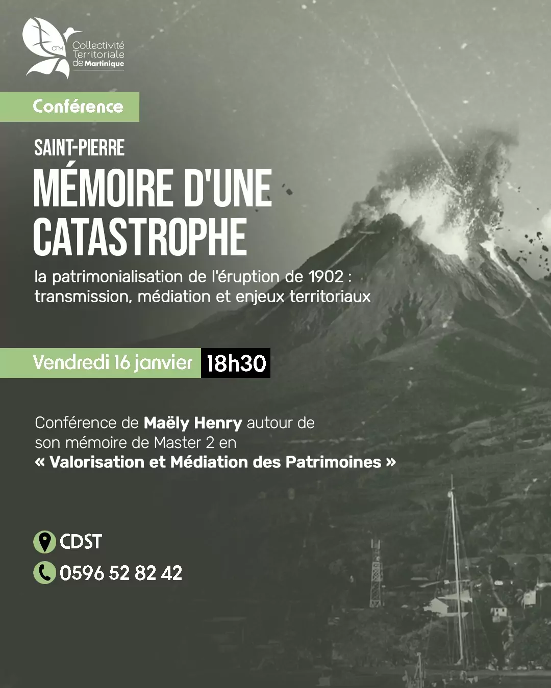 La conférence s’appuie sur le mémoire de Master 2 de Maëly Henry, consacré à la valorisation et à la médiation des patrimoines liés à l’éruption de 1902, entre mémoire collective, histoire et pratiques culturelles contemporaines.