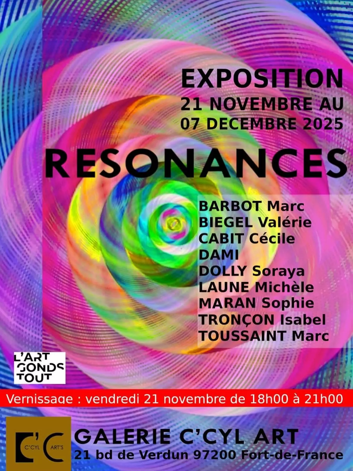 L’association artistique et culturelle L’art Gonds Tout présente l’exposition « RÉSONANCES » à découvrir du 21 novembre au 07 décembre 2025, à la galerie C’CYL ART située au 21bd de Verdun à Fort de France.