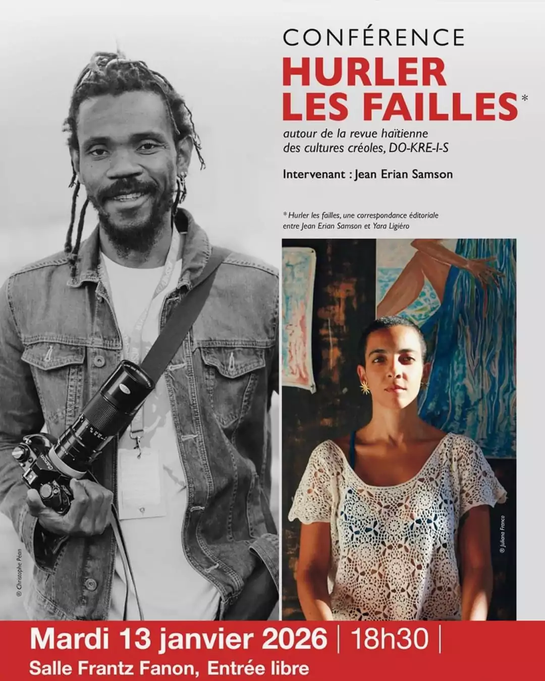 – CONFÉRENCE : Hurler les failles, autour de la revue des cultures créoles DO-KRE-I-S. Intervenant Jean Erian Samson (doctorant en recherche-création à la Faculté de Lettres et des Sciences humaines de l’Université de Limoges) – mardi 13 janvier à 18h30