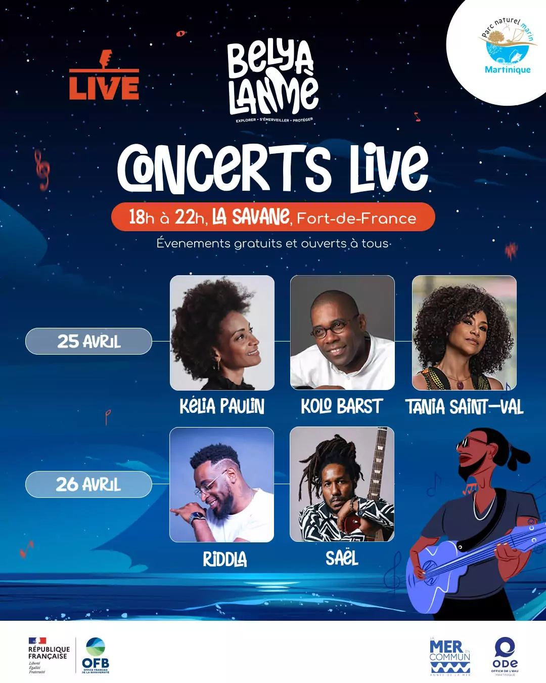 Les vendredi 25 et samedi 26 Avril, de 18h à 22h, direction la Savane à Fort-de-France pour nos Concerts en Live