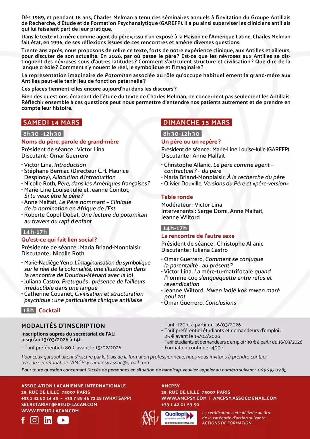 A l’issue de ces rencontres autour de la filiation, de la fonction du père, de la place de la mère, comme de l’inscription psychique de l’histoire dans la communauté antillaise, nous ouvrons deux journées intitulées « Par où ça passe le père ? », à l’hôtel Karibea le samedi 14 et le dimanche 15 mars de 8h à 17h30.