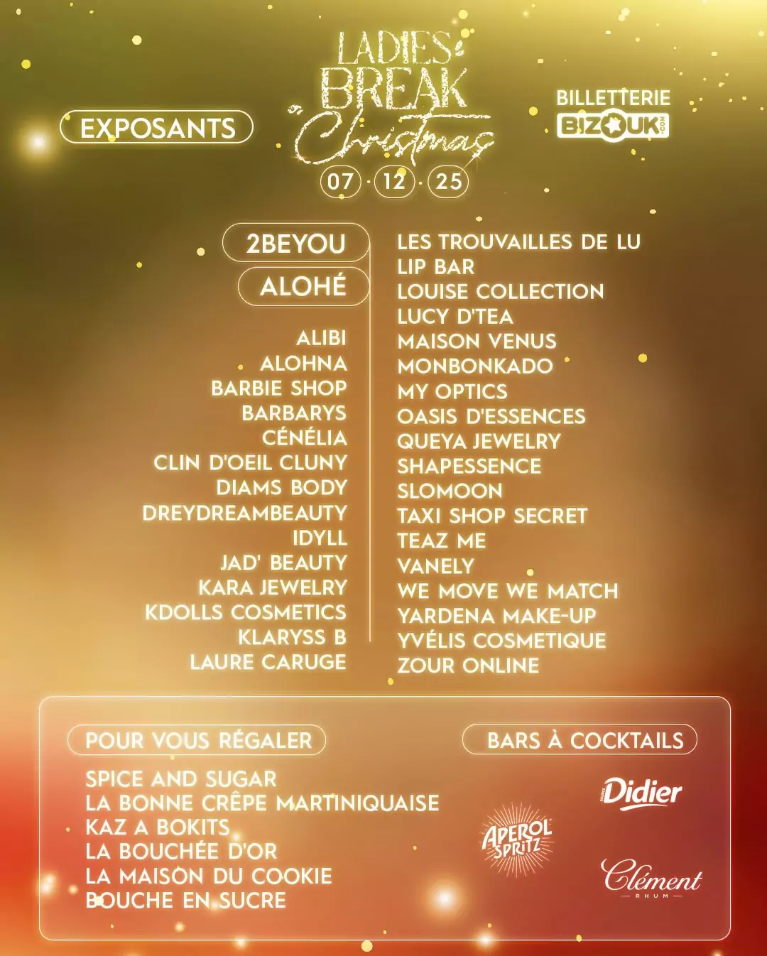 Les exposants du showroom vous préparent des collections exclusives, des offres spécifiques que vous n’aurez qu’à la LADIES BREAK ! Bijoux, accessoires, cosmétiques, pochettes, sacs à main, parfums, produits capillaires, remise en forme, lunettes, prêt à porter, produits et services bien-être, produits de soin corps, bougies, LoveToys, etc. à prix exclusifs !