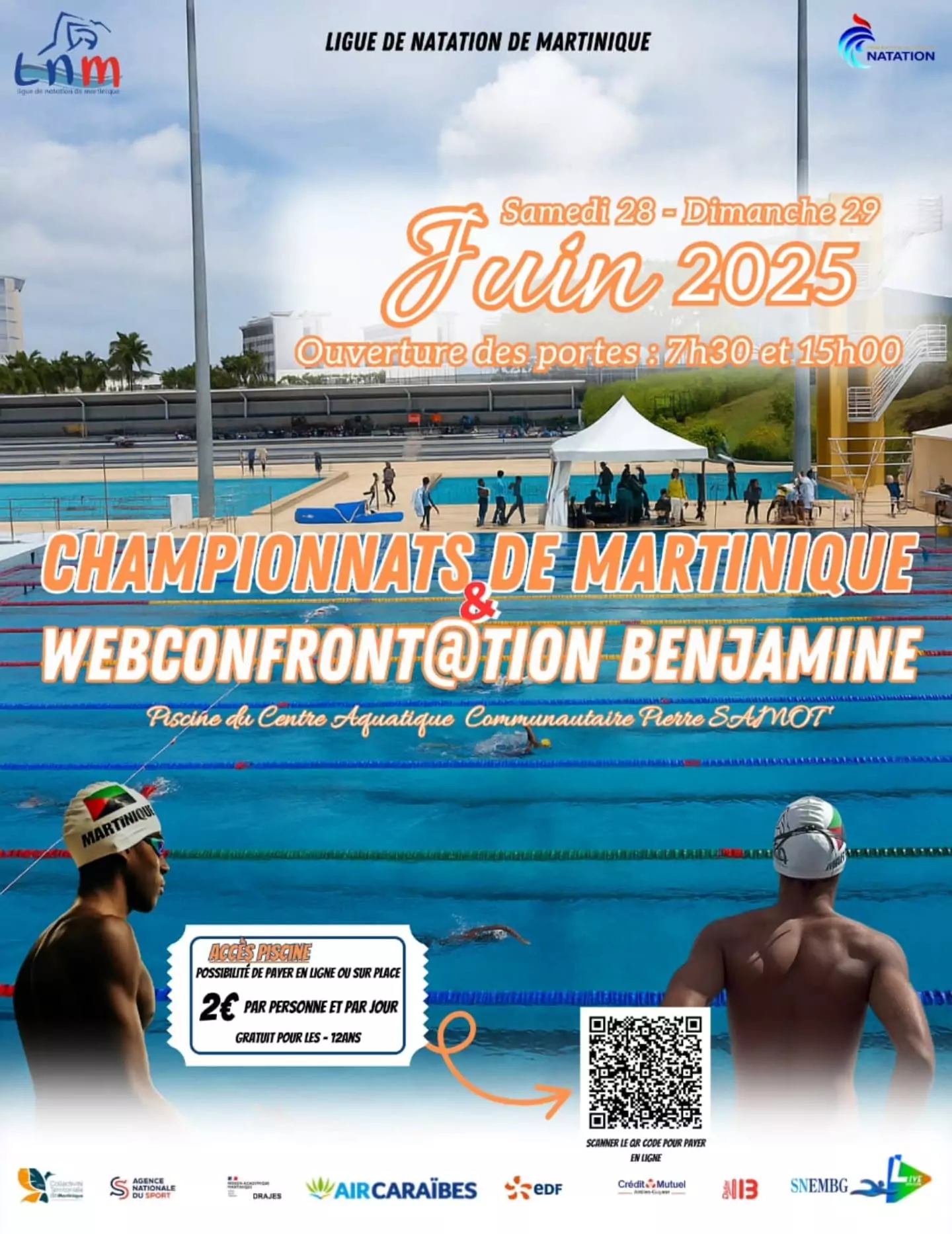 Les 28 et 29 juin 2025, la Ligue de Natation de Martinique vous donne rendez-vous au Centre Aquatique Communautaire Pierre Samot pour les Championnats de Martinique & la Webconfrontation Benjamine