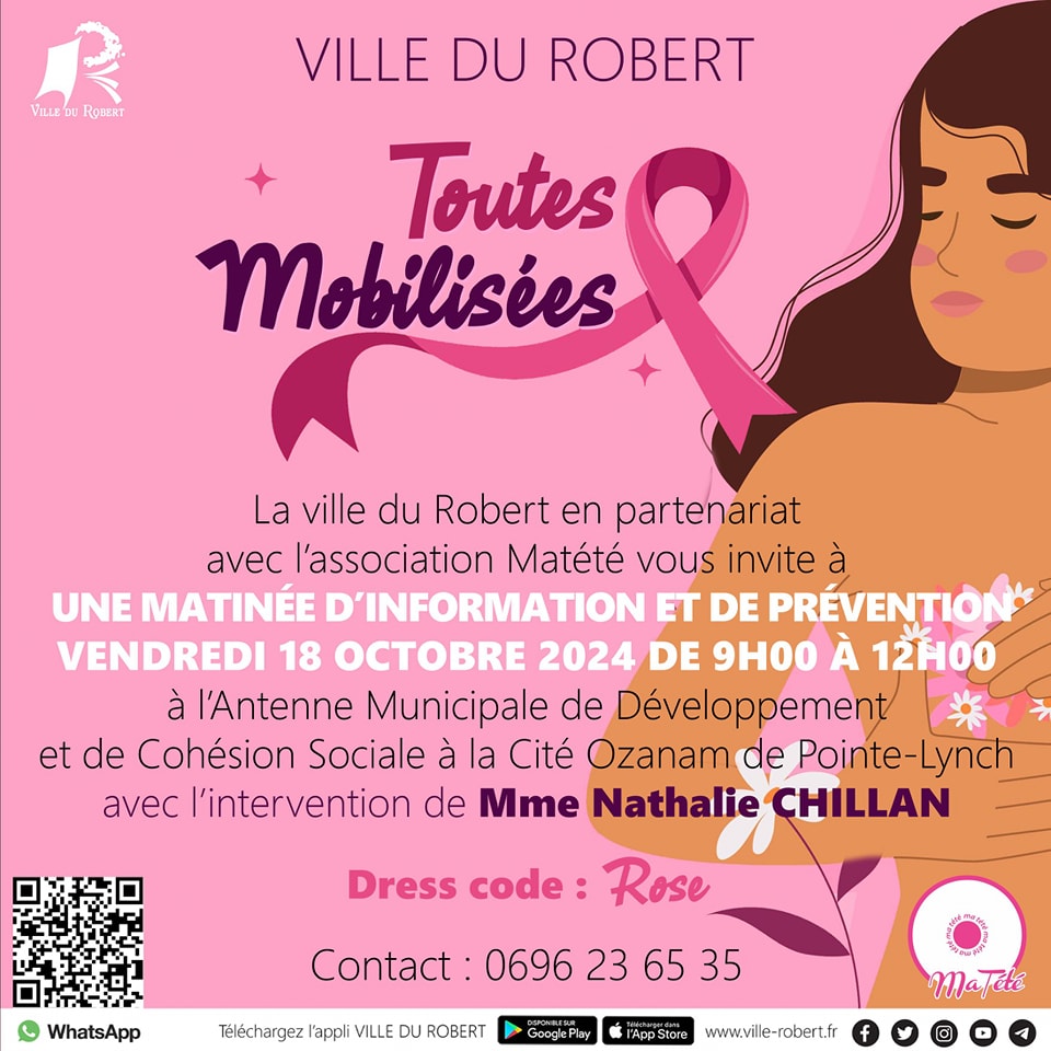La ville du Robert en partenariat avec l’association Matété vous invite à 𝐔𝐍𝐄 𝐌𝐀𝐓𝐈𝐍𝐄́𝐄 𝐃’𝐈𝐍𝐅𝐎𝐑𝐌𝐀𝐓𝐈𝐎𝐍 𝐄𝐓 𝐃𝐄 𝐏𝐑𝐄́𝐕𝐄𝐍𝐓𝐈𝐎𝐍 𝐕𝐄𝐍𝐃𝐑𝐄𝐃𝐈 𝟏𝟖 𝐎𝐂𝐓𝐎𝐁𝐑𝐄 𝟐𝟎𝟐𝟒 𝐃𝐄 𝟗𝐇𝟎𝟎 𝐀̀ 𝟏𝟐𝐇𝟎𝟎 à l’Antenne Municipale de Développement et de Cohésion Sociale à la Cité Ozanam de Pointe Lynch avec l’intervention de Mme Nathalie CHILLAN