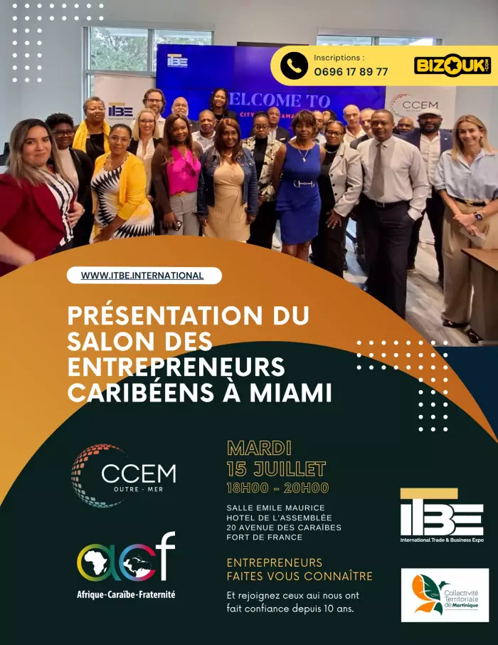 L’ITBE (International Trade & Business Expo) est un salon initié par le Collectif Coopération Export Martinique (CCEM) à Miami depuis 2023. Il vise à accompagner les entreprises de la Caraïbe, d’Afrique et de l’Europe dans leur développement international à travers des conférences et rencontres professionnelles.