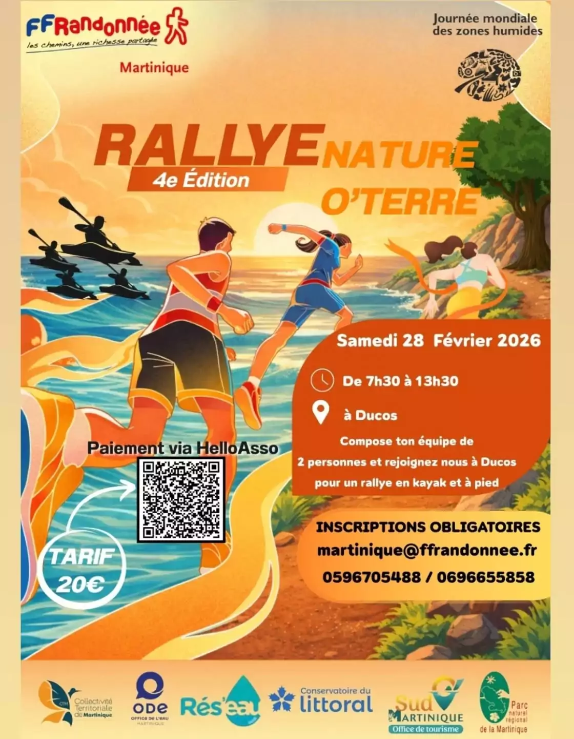 Dans le cadre de la journée mondiale des zones humides, le Comité de la Randonnée Pédestre de la Martinique organise la 4ème édition du Rallye Nature O’Terre qui se tiendra le Samedi 28 Février 2026 dans la commune de Ducos.