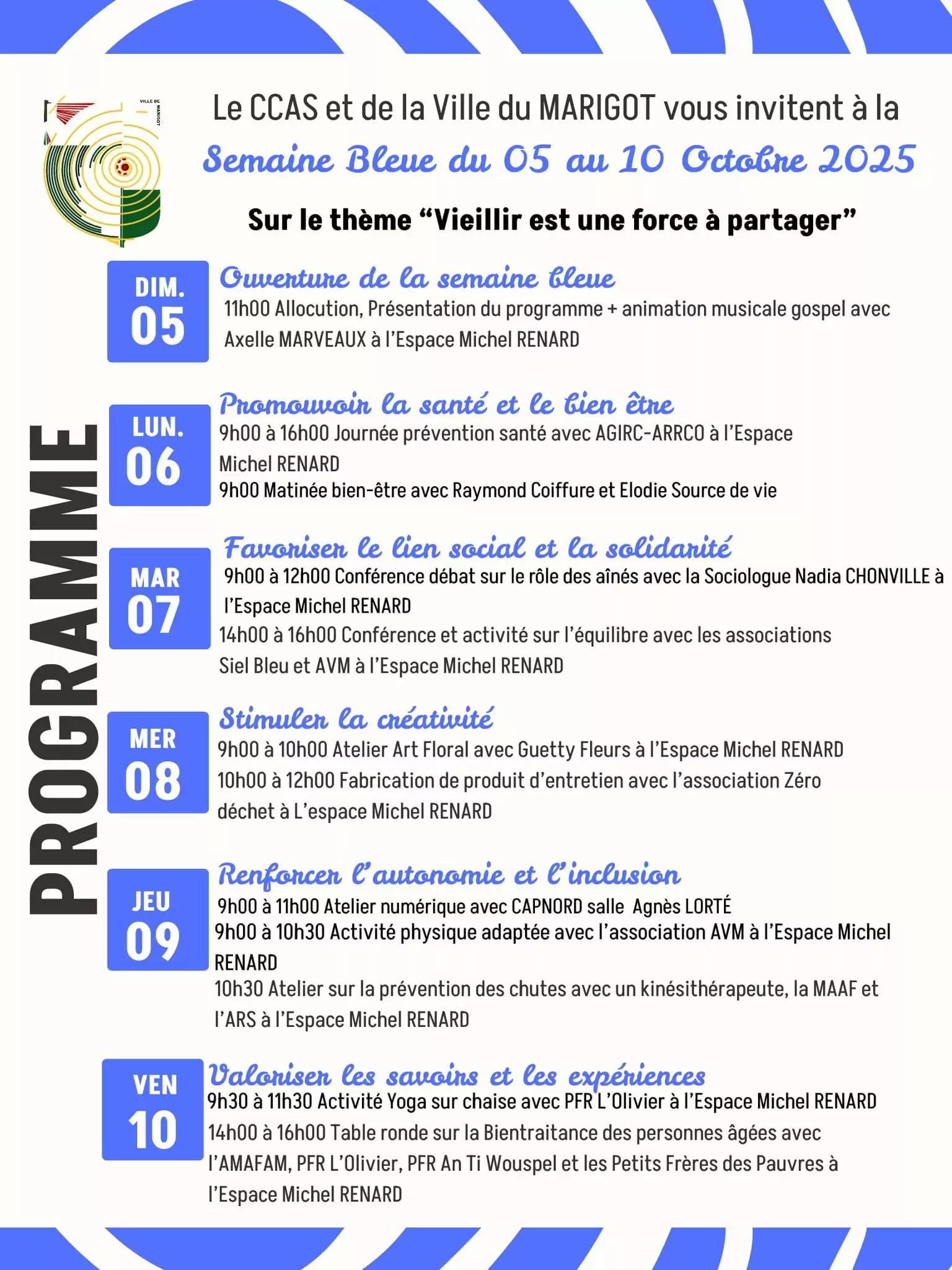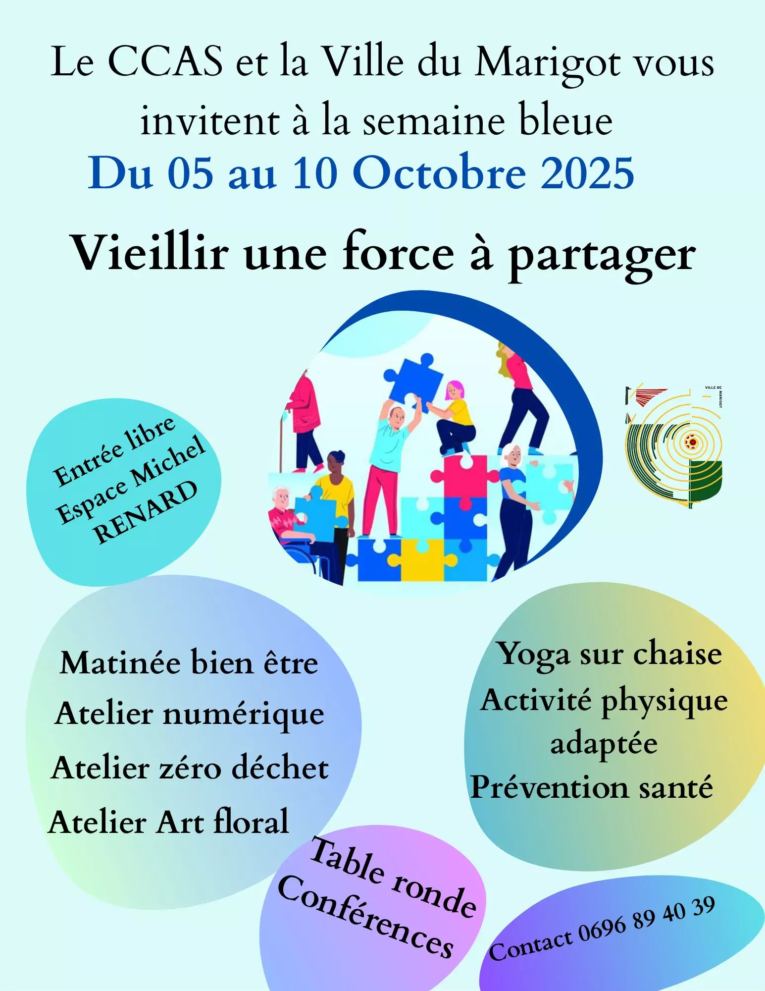À l’occasion de la semaine bleue, le CCAS propose un programme d’activité du 06 au 10 Octobre sur le thème « Vieillir une force à partager » : matinée bien être, atelier numérique, activité physique adaptée, prévention santé, conférences etc…