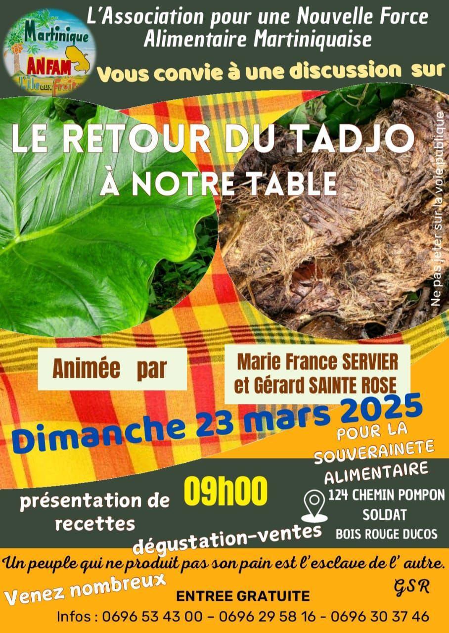 En collaboration avec la ville, l’Association pour une Nouvelle Force Alimentaire Martiniquaise (ANFAM) vous convie à une 𝐃𝐈𝐒𝐂𝐔𝐒𝐒𝐈𝐎𝐍 𝐒𝐔𝐑 𝐋𝐄 𝐑𝐄𝐓𝐎𝐔𝐑 𝐃𝐔 𝐓𝐀𝐃𝐉𝐎 𝐍𝐎𝐓𝐑𝐄 𝐓𝐀𝐁𝐋𝐄 𝐏𝐎𝐔𝐑 𝐋𝐀 𝐒𝐎𝐔𝐕𝐄𝐑𝐀𝐈𝐍𝐄𝐓𝐄