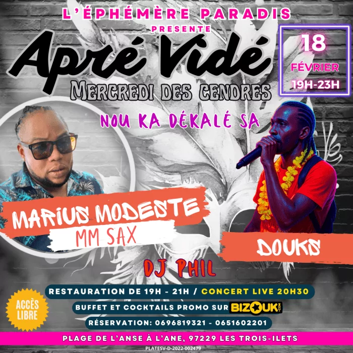 SOIRÉE MERCREDI DES CENDRES « APRÉ VIDÉ » À L’ÉPHÉMÈRE PARADIS, LES TROIS ÎLETS