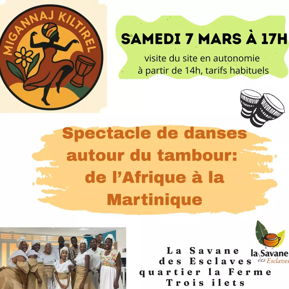 SPECTACLE DE DANSE AUTOUR DU TAMBOUR « DE L’AFRIQUE À LA MARTINIQUE » À LA SAVANE DES ESCLAVES, LES TROIS ÎLETS