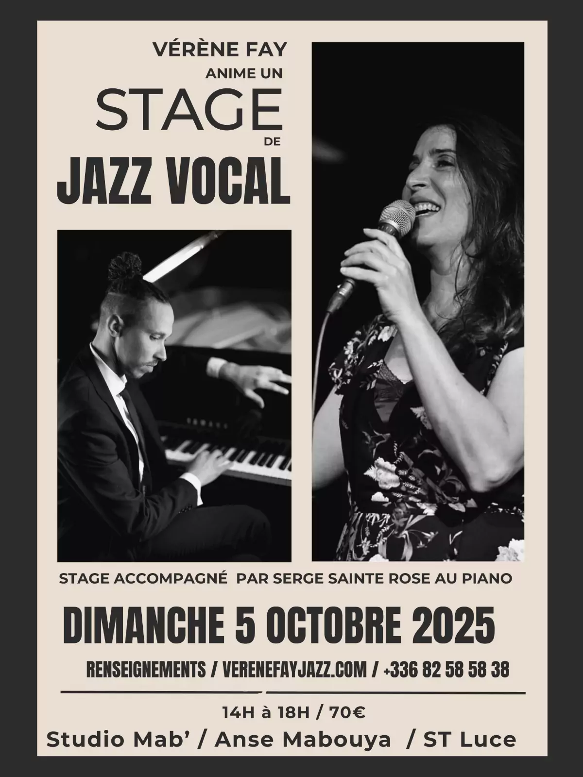 Il reste 3 places pour un après-midi intense de jazz vocal avec Vérène Fay (chant) et Serge Sainte-Rose (piano) au Studio Mab, Sainte-Luce.