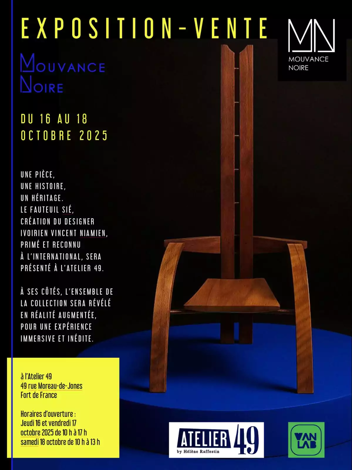 Mouvance Noire, agence curatoriale qui promeut et représente des designers de mobilier issus de la Caraïbe, du continent Africain et de la diaspora, invite le public à découvrir une pièce emblématique , le fauteuil « Sié » de l’artiste/designer ivoirien Vincent NIAMIEN.