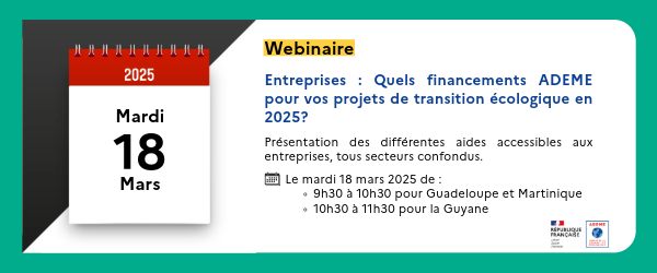 Nous vous invitons à participer au webinaire : "Entreprises : Quels financements ADEME pour vos projets de transition écologique en 2025?". Le 18 mars 2025 9h30-10h30 (heure Guadeloupe/Martinique) 10h30-11h30 (heure Guyane) Ce webinaire vous présentera [...]