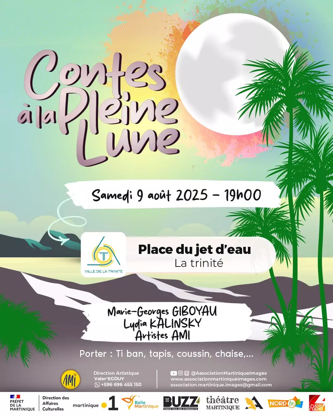 𝗖𝗢𝗡𝗧𝗘𝗦 𝗔̀ 𝗟𝗔 𝗣𝗟𝗘𝗜𝗡𝗘 𝗟𝗨𝗡𝗘 ! Avec Marie-Georges GIBOYAU, Lydia KALINSKY, Daniel CIBRELUS et Artistes AMI Place du jet d'eau, Ville de La Trinité - Martinique Entrée libre, pour Petits et Grands Apportez ti ban, [...]