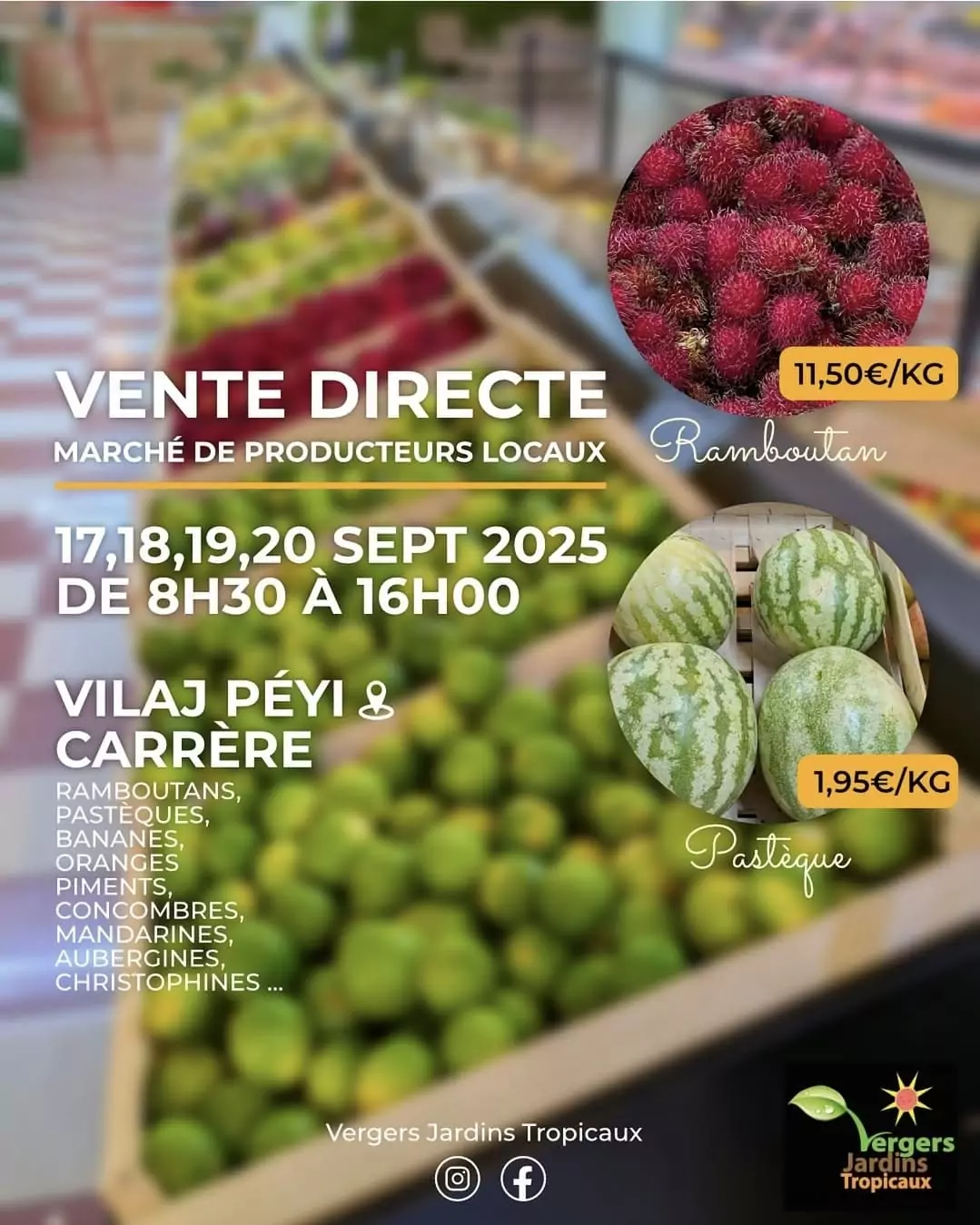 ![]() L'association LASOTÈ, vous propose un panier de fruits et légumes frais du pays de saison à 22€ pour une quantité de 8 à 8,5 kg. Pour vos commandes envoyez nous un message au 0696 55 [...] ![]() Vergers Jardins Tropicaux vous invite à un rendez-vous hebdomadaire du Mardi au samedi. Cette semaine, deux fruits phares ! Venez découvrir le nouveau point de vente de la coopérative Vergers et Jardins Tropicaux à Vilaj [...] ![]() MARCHÉ LOCAL MANRINA aux anses d’arlet Fruits, légumes, poissons, viandes, produits sains, artisanat, et plus encore !Consommez local, sain et responsable Tous les mercredis | 7h - 13h au domaine diam arlet ! Domaine Diam-Arlet, [...] |