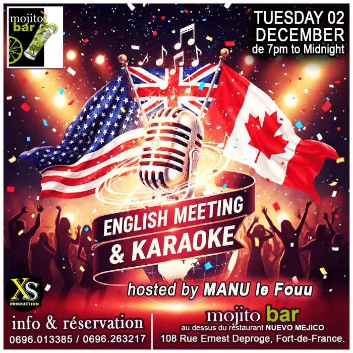 Come speak and sing in English and have fun with your friends and colleagues at the Mojito Bar in Fort de France. (Above the NUEVO MEJICO) English Meeting & KARAOKE hosted by MANU le Fouuu. [...]