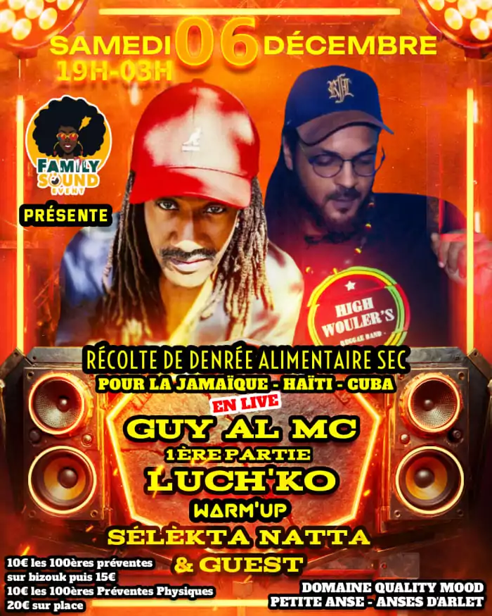 FAMILY SOUND EVENT PRÉSENTE Une soirée 100% good vibes au service d’une belle cause Récolte de denrées alimentaires sèches pour soutenir la Jamaïque, Haïti et Cuba EN LIVE AVEC HIGH WOULER’S : GUY AL MC [...]