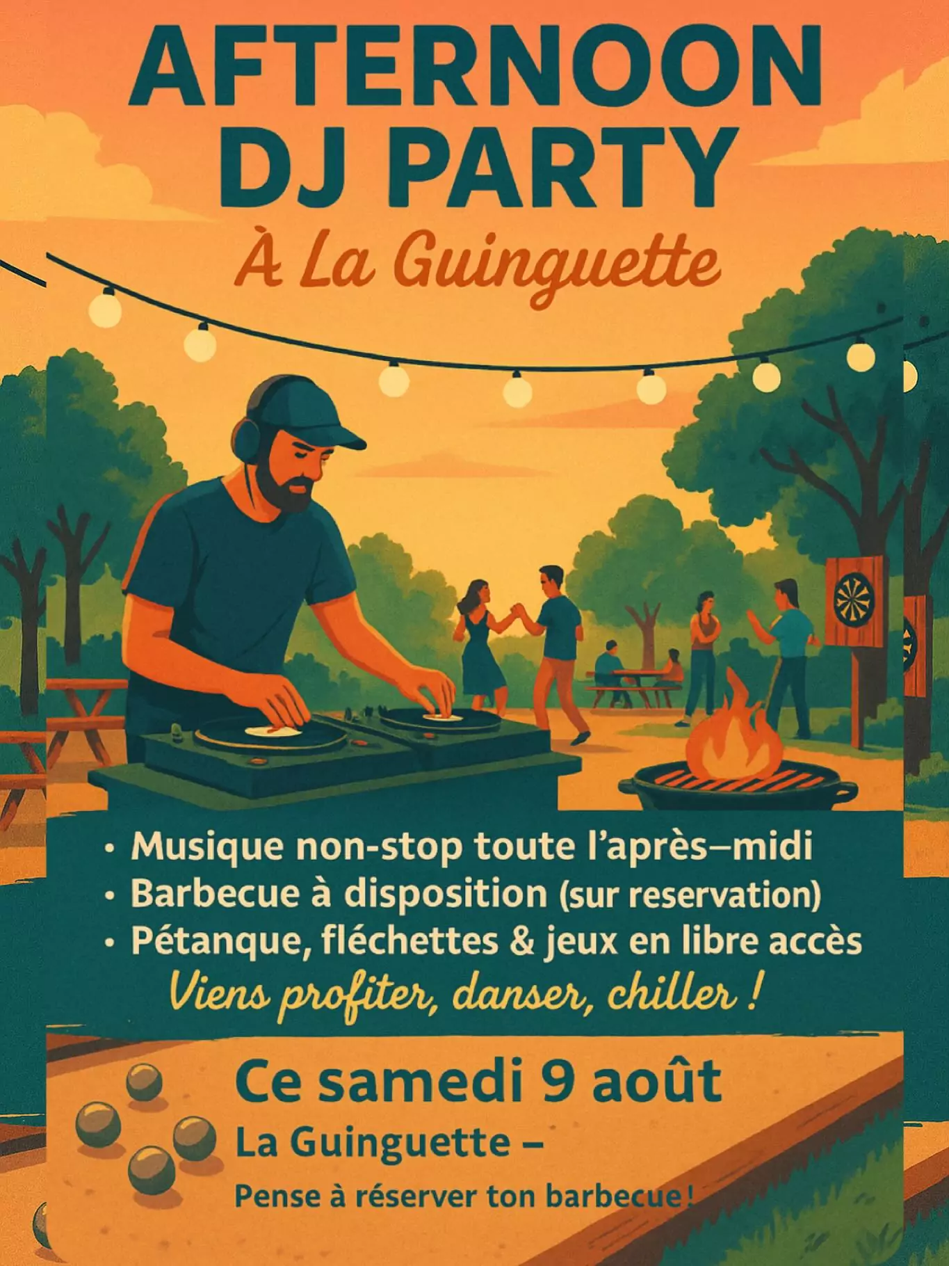 ![]() Ambiance 100% chill ! Musique non-stop toute l’après-midi Barbecue à disposition (sur réservation) Pétanque, fléchettes & jeux en libre accès Viens profiter, danser, chiller ! L’abus d’alcool est dangereux pour la santéà consommer avec modération. [...] ![]() Blind Test + Karaoké Salle Restaurant Un micro, des hits, des fous rires… et Pat aux commandes ! Ambiance détente, défis musicaux et refrains partagés entre amis Devine les sons Prends le mic Laisse-toi porter par [...] |