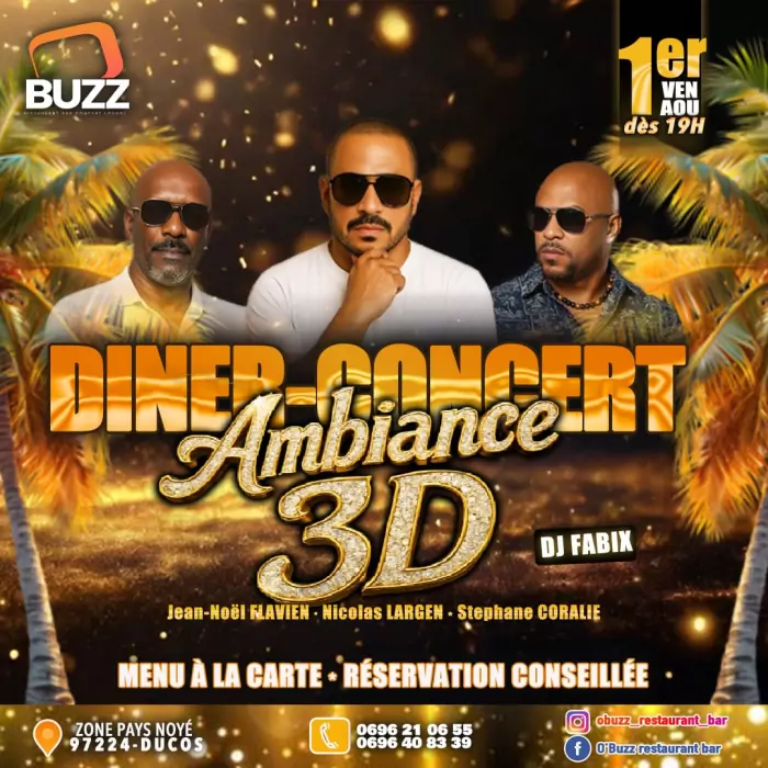 ![]() Afterwork dans une ambiance musicale animée par DJ DOUBL'D. Restaurant Le Jardin des Alizé, Karibea Squash Hôtel, rue de la Libération, Fort-de-France, 0596 72 80 80 ![]() Ce VENDREDI 1er Août le Restaurant O’Buzz reçoit pour un Dîner-Concert le groupe Ambiance 3D De 19h à 02 h Réservations vivement conseillées au 0696 40 83 39 0696 21 06 55 Restauration à la [...] ![]() Ambiance 100% tropicale, chaleureuse et ensoleillée ! Zouk, soul, reggae, variétés caribéennes... Dream Mizik enchaîne les plus beaux morceaux avec complicité, chaleur et énergie. La piste de danse est à vous : en couple, entre [...] |