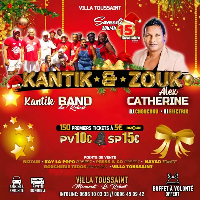 Avec KANTIK BAND du Robert (Partie KANTIK) et ALEX CATHERINE (Partie ZOUK) pour une bonne ambiance Dj Chouchou et Dj Electrik 150 premiers tickets à 5€ Uniquement sur Bizouk Pv 10€ SP 15€ Un Buffet [...]