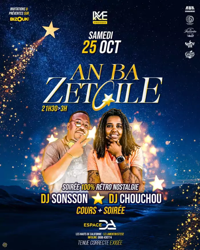 DJ Chouchou & DJ Sonsson Une nuit étoilée , un ciel illuminé de musique et d'amour... La soirée An Ba Zétoile Act 2 sera magique , avec les rythmes envoûtants du zouk qui nous transporteront [...]