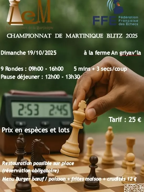 ![]() La Ligue d’Echecs de Martinique organise le Championnat de Martinique Blitz 2025 Le dimanche 19 octobre 2025 à la ferme An Griyav’la au Robert Pour s’inscrire : https://docs.google.com/.../1FAIpQLSez07043OrWqK.../viewform Nombre de rondes : 9 Cadence : 5 [...]