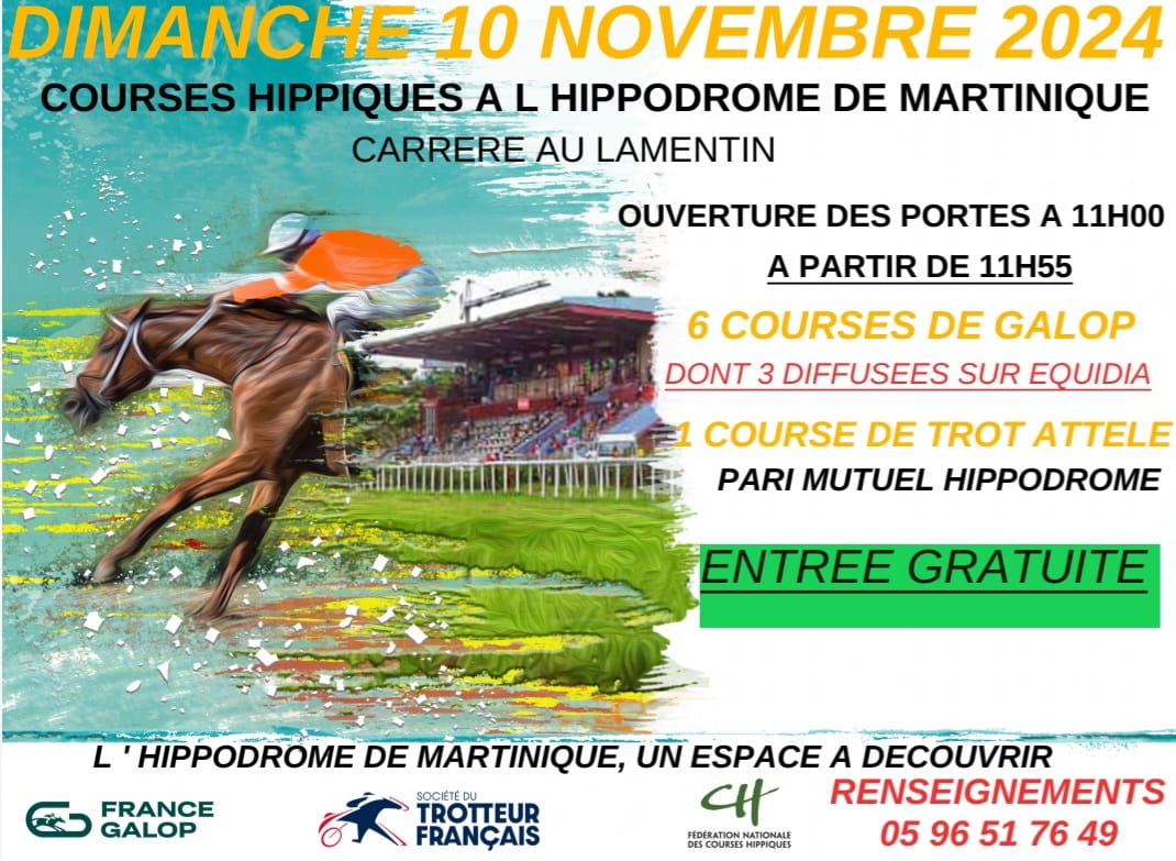 ![]() PROGRAMME DES COURSES HIPPIQUES (sous réserve) Hippodrome de Martinique Bruyère Dawson, Carrère, Le Lamentin Collectivité Territoriale de Martinique CTM, Rue Gaston Defferre, Plateau Roy, Cluny, Fort-de-France |