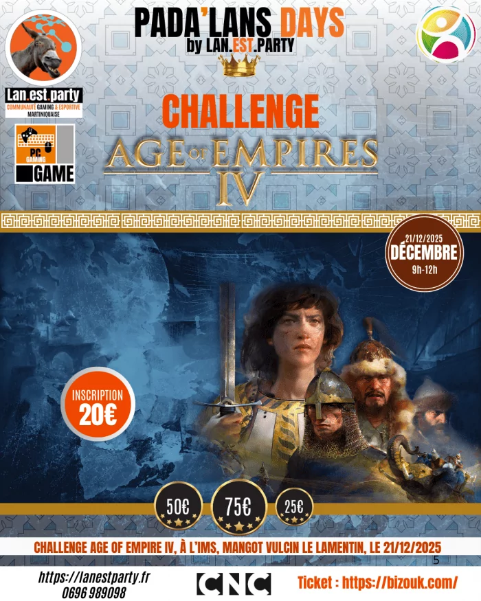 Age of Empires IV débarque sur PC ! Challenge spécial à l’IMS le 20/11/2025 dès 9h pour les PADA’LANS DAYS by LAN.EST.PARTY Mini tournoi + free play Inscriptions :sur Bizouk Infos : 0696 98 90 [...] |