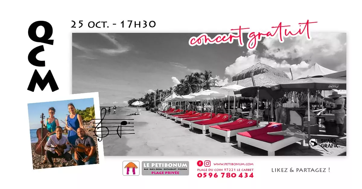 L'ensemble QCM, en formation quatuor à cordes (2 violons, alto, violoncelle), vous convie à un concert les pieds dans le sable. Retrouvez-nous au Petibonum, sur la plage du Carbet où il fait toujours beau pour [...]