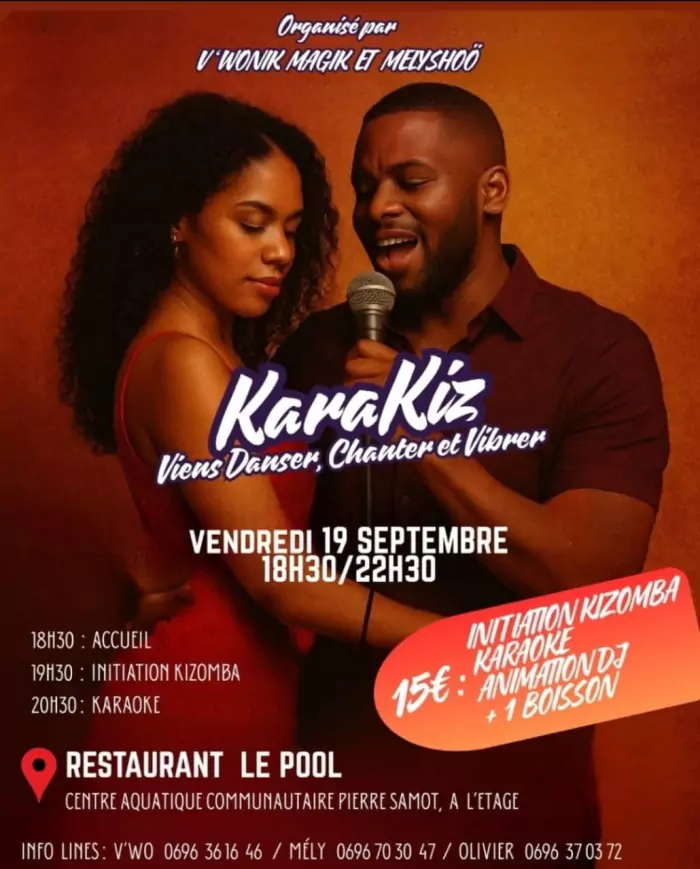 Mélishoo & V’wonik Magik Danse – Chante – Vibre Vendredi 19 septembre 2025 Centre Aquatique Pierre Samot – Restaurant Le Pool (Lamentin) Réservé aux +25 ans 18h30 Accueil 19h30 Initiation Kizomba 20h30 – 22h30 Karaoké [...]