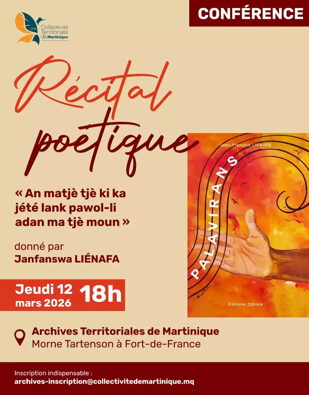 Janfanswa LIÉNAFA vous convie à un récital poétique : "An matjè tjè ki ka jété lank pawol-li adan ma tjè moun" Une inscription préalable est indispensable à l'adresse suivante : archives-inscription@collectivitedemartinique.mq HORAIRES Lundi, mardi et [...]