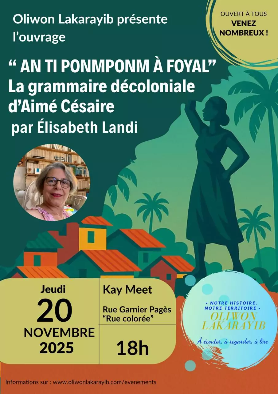 Venez découvrir l'ouvrage "An ti Ponm Ponm à Foyal : une grammaire décoloniale d'Aimé Césaire" Elisabeth LANDI. Un événement @oliwonlakarayib Kay Meet, 23 rue Garnier Pagès, Fort-de-France, 0696 29 43 41