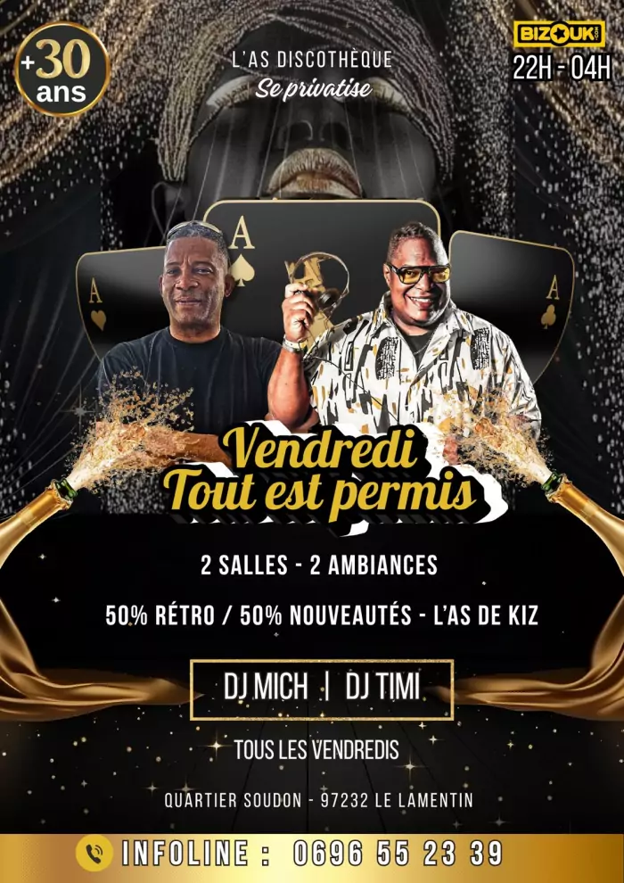 L'as Discothèque Quartier Soudon, Le Lamentin, Martinique,L'espace *L'as Discothèque au lamentin se privatise* pour 1 clientèle *fun-chic & branché* * *Femme 10€* * *Homme 10€* *2 salles 2 ambiances* salle1 100% nostalgie Salle 2 zouk/ kompa *La direction se reserve le [...]