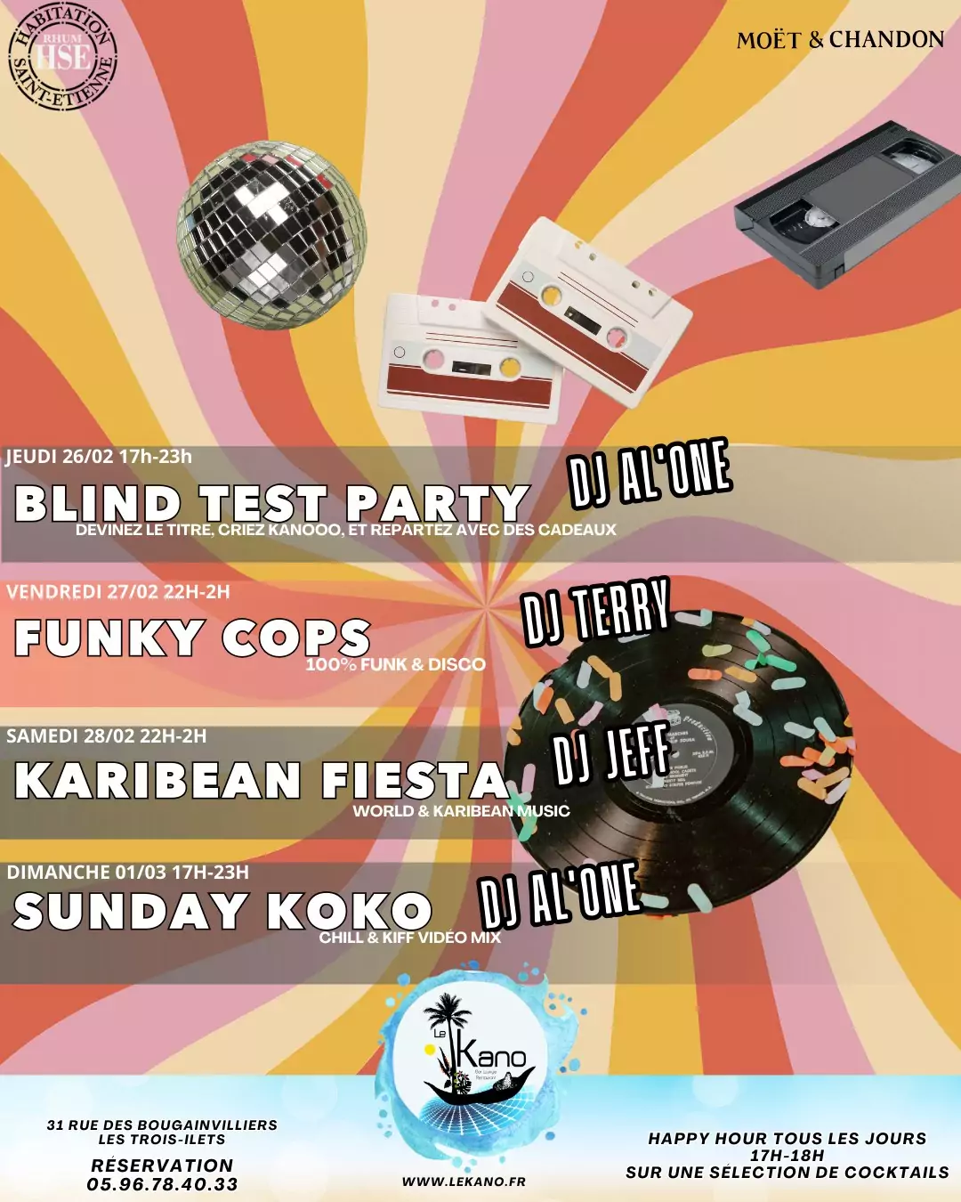 Ce week-end au KANOJeudi 17hBLIND TEST PARTYDJ AL'ONEDevinez le titre et l'artiste, dites KANOOO!!! et repartez avec des cadeauxVendredi 22hFUNKY COPSDJ TERRY100% FUNK & DISCOAmbiance so Groovy & Funky ce vendredi au KANOSamedi 22hKARIBEAN FIESTADJ [...]