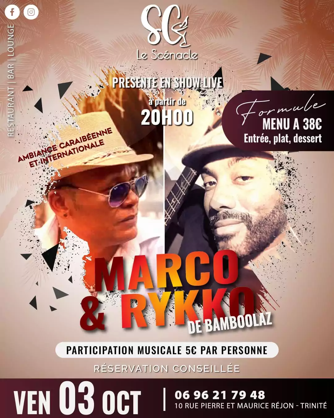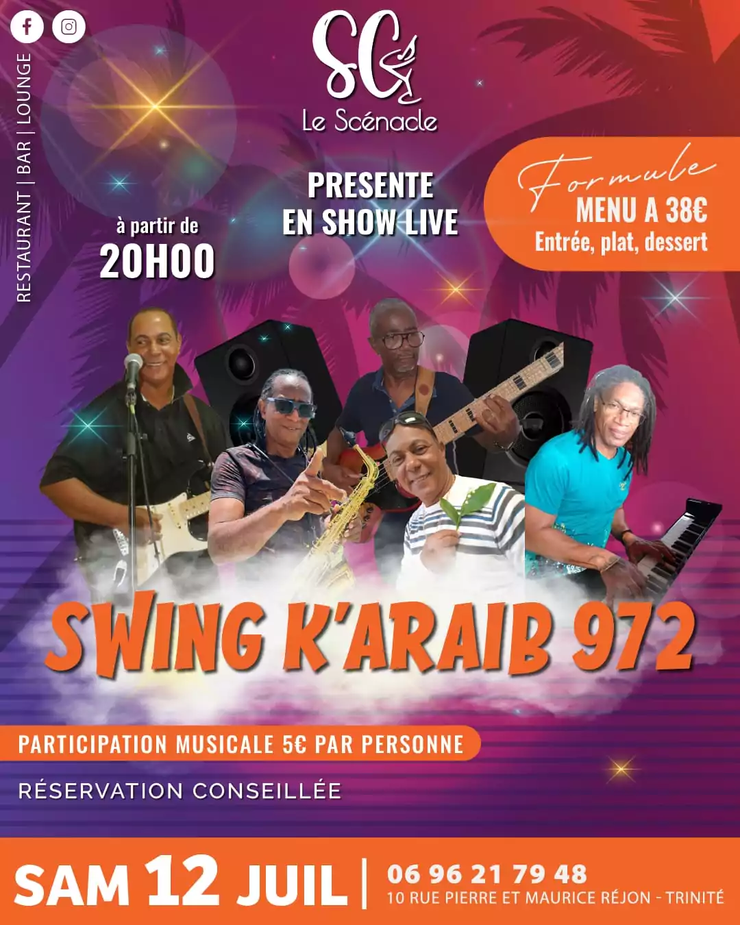 Le Scénacle 10 rue Pierre et Moris Région, La Trinité, MartiniqueMenu spécial : 38€ (Entrée, plat, dessert) Participation musicale : 5€ par personne Réservation conseillée au 06 96 21 79 48 - 06 96 43 31 28 Le Scénacle, 10 rue Pierre et Maurice [...]