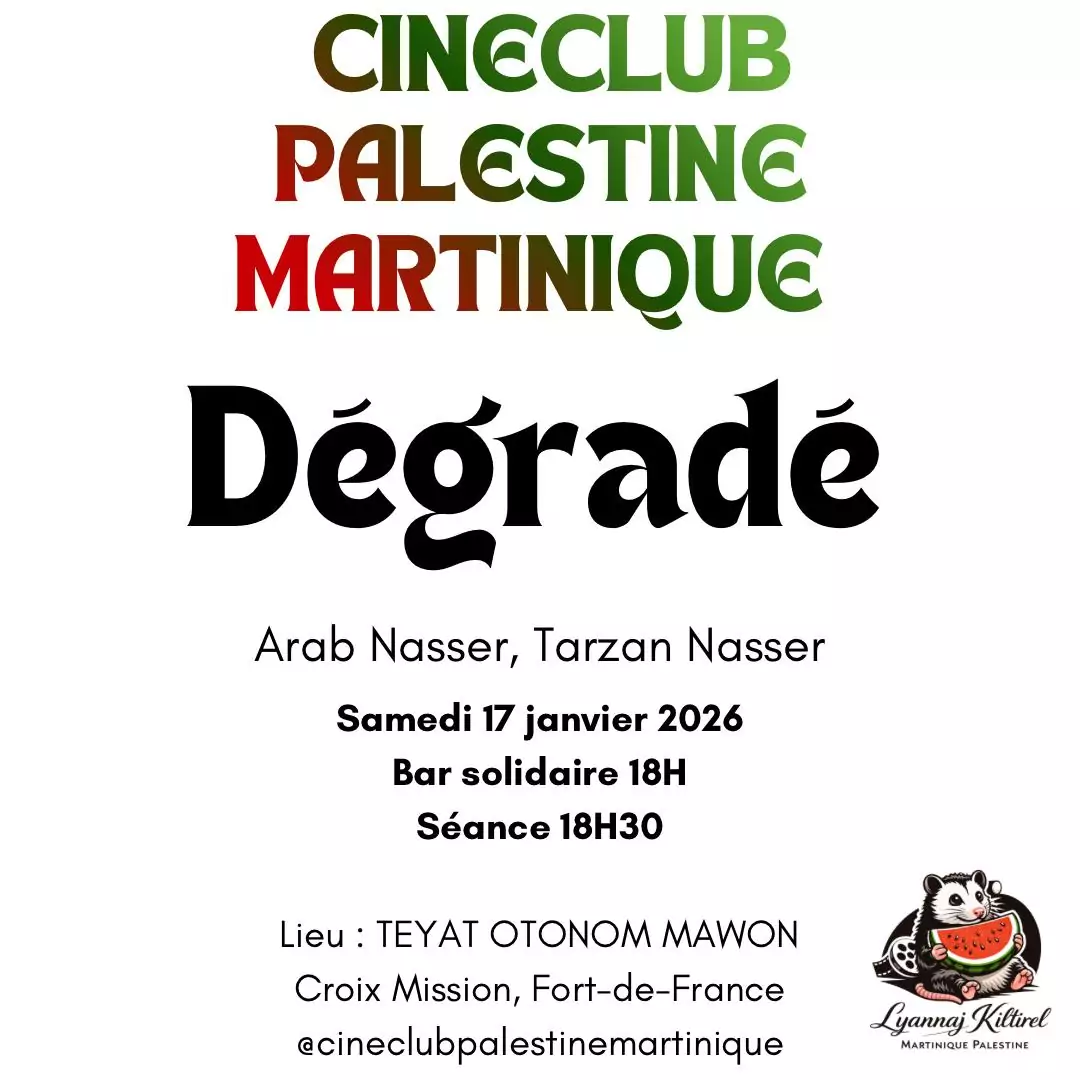 Projection – Cinéclub Palestine Martinique Le Cinéclub Palestine Martinique a le plaisir de vous inviter à la projection du film *Dégradé*, un film *d’Arab Nasser et Tarzan Nasser*. En ce début d’année, nous vous vous [...]
