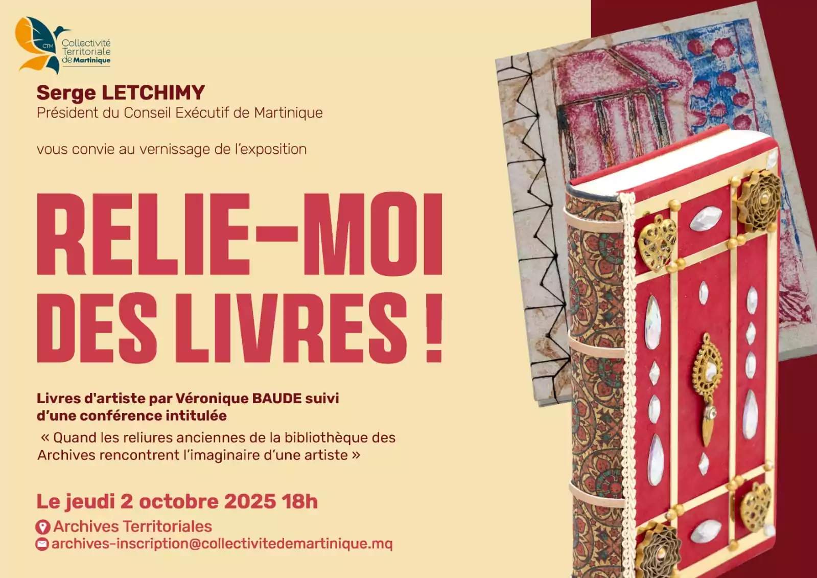 Archives Départementales de Martinique 19 avenue Saint-John Perse, Morne Tartenson, Fort-de-France, MartiniqueNouvelle exposition des Archives territoriales de Martinique : "Relie-moi des livres !" Livres d'artiste par Véronique BAUDE ou comment les reliures anciennes des ouvrages conservés à la Bibliothèque des Archives ont rencontré l'imaginaire d'une artiste [...]