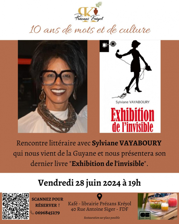 PrésenceKréol 40 rue Antoine Siger, Fort-de-France, MartiniqueMoment littéraire avec l'Auteure Sylviane VAYABOURY qui nous vient de la Guyane...un échange plaisant autour de son œuvre "L'exhibition de l'invisible". Présence Kréol, 40 rue Antoine Siger , Fort-de-France, 0596 30 46 36