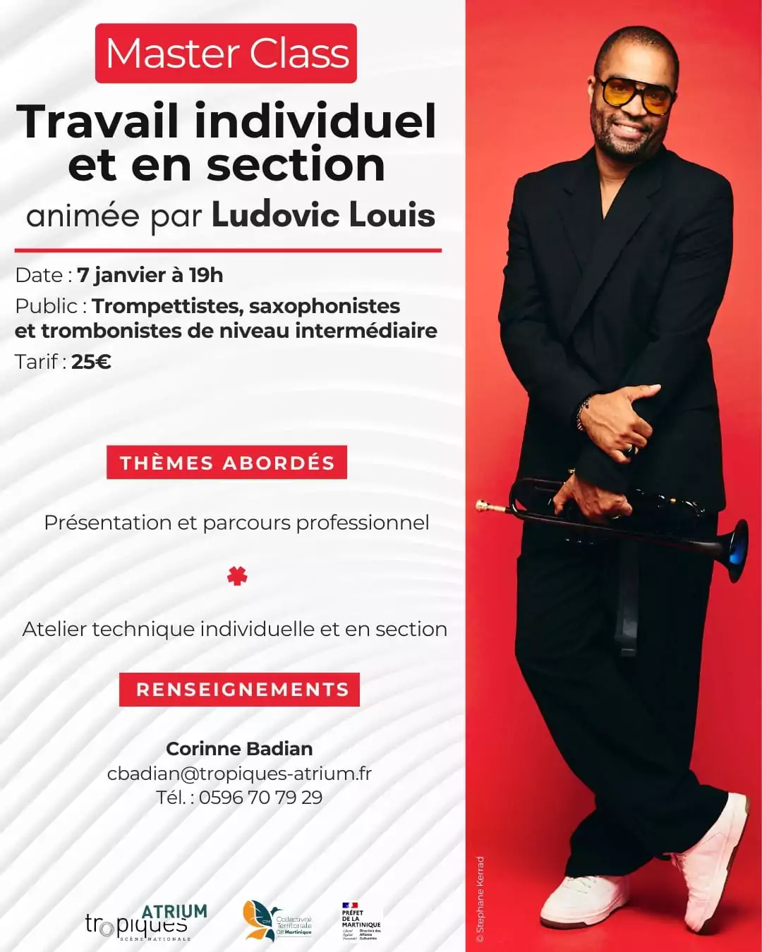 Masterclass animée par Ludovic Louis sur le travail individuel et section pour les trompettistes, saxophonistes et trombonistes de niveau intermédiaire ! Plus d'infos : https://tropiques-atrium.fr/.../masterclass-de-ludovic.../ Tropiques Atrium, 6 rue Jacques Cazotte, Fort de France, 0596 [...]